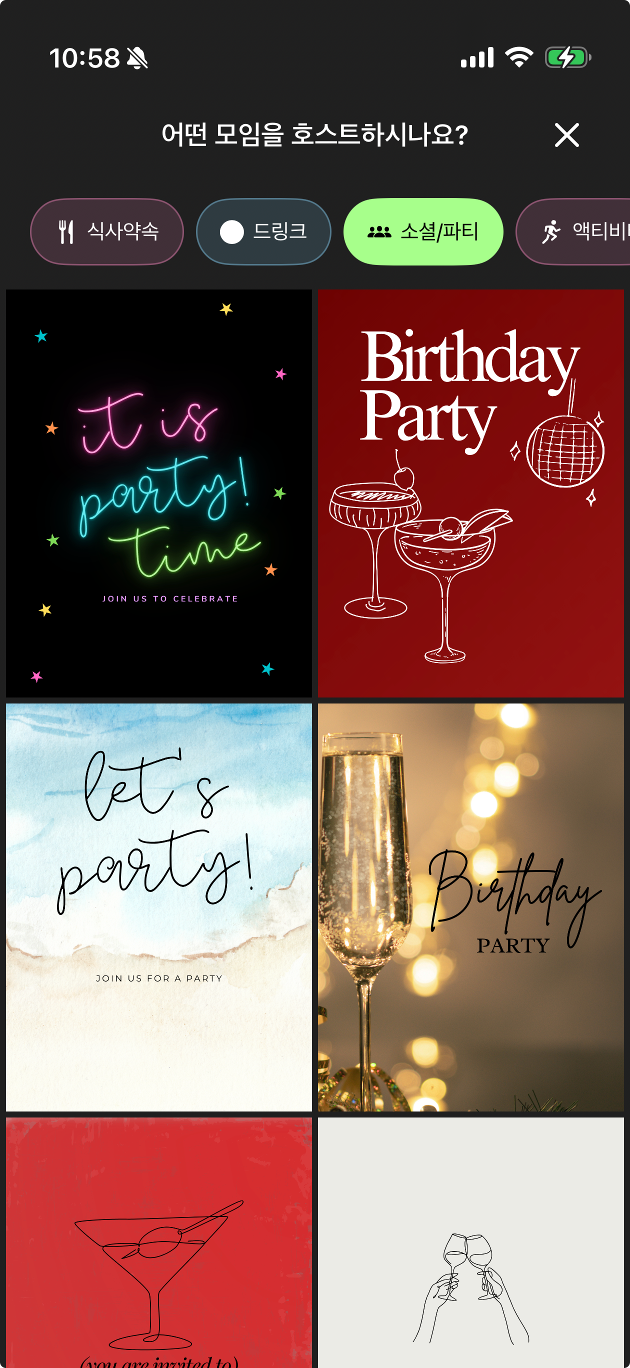 모임 만들기를 누르고, 초대장 하나를 고르고, 장소명과 공지사항을 적은 뒤 링크를 복사해 같이 만날 사람들에게 공유하면 끝이다.