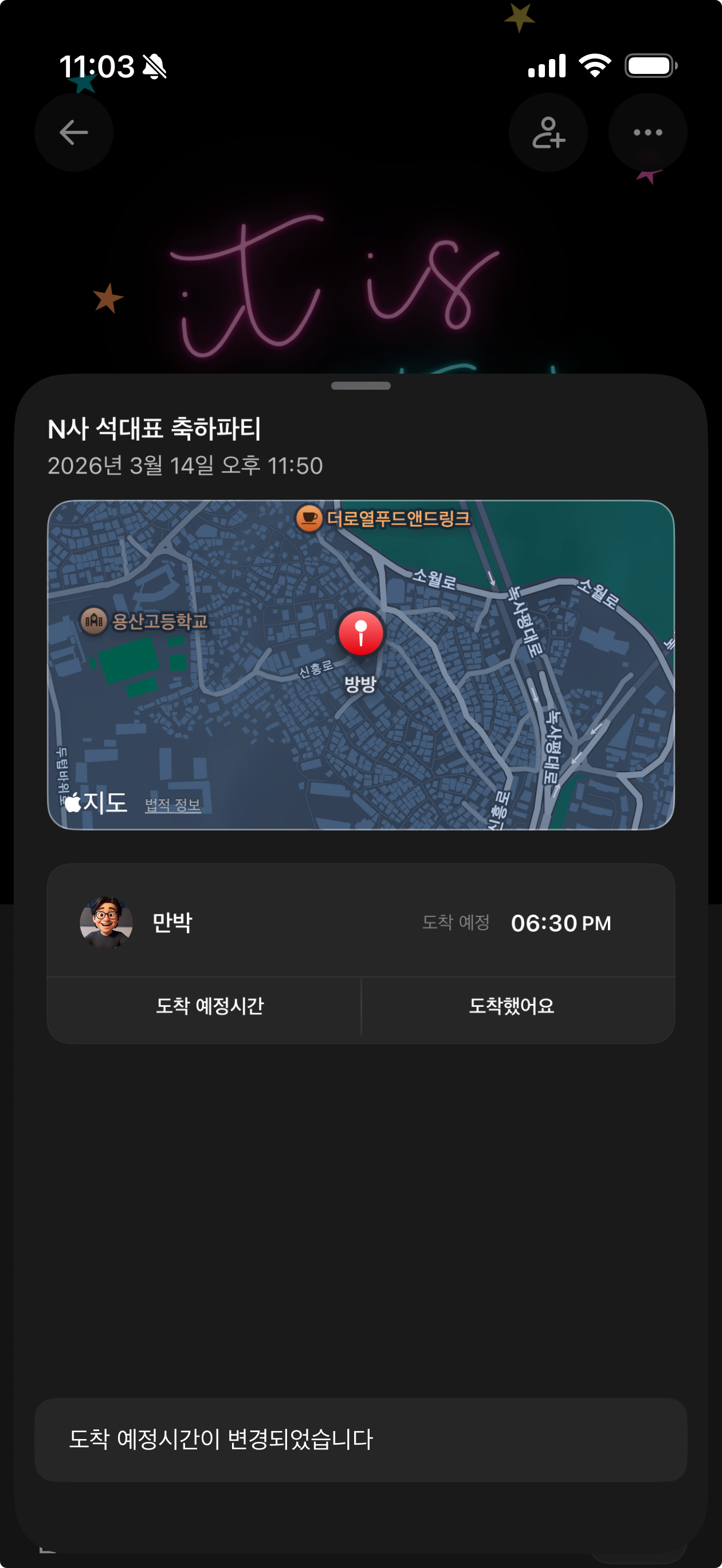 배민 주문하고 배달이 시작됐을 때처럼, 지금 이 모임이 가까워지고 있다는 게 잠금화면에서 자연스럽게 보인다.